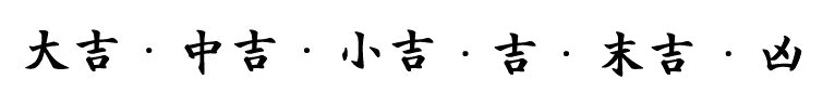 Omikuji sold at Sensoji temple have English explanations as well as Japanese on the back, but that is very unusual. So if you ever feel like drawing omikuji and bringing it back home for a keepsake, here is some useful info. If your omikuji has Chinese characters (called kanji) that look like the ones at the far left then it means that you got the best one ,Daikichi (Good luck). If the kanji looks like the one at the far right, that is Kyoo (Bad luck). As you go from left to right, your luck goes from good to bad. Well.... Good luck!!! |
